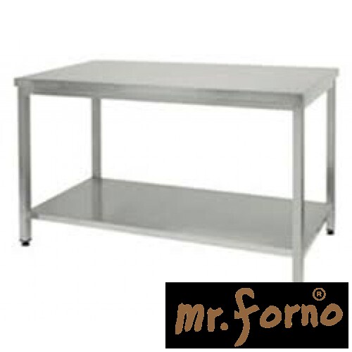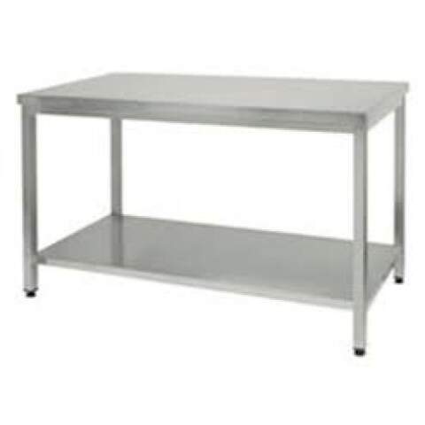 Masa de lucru confectionata integral din inox. Dimensiuni:1400x600x850h mm Realizata din otel inox cu finisaj Scotch Brite, grosime 1 mm Imbinari sudate cu ARGON Structura inox AISI 304 picioare din teava rectangulara din inox 10x40x1.5 mm reglabile pe inaltime Blat rigidizat cu pal nemelaminat Polita inferioara din inox.