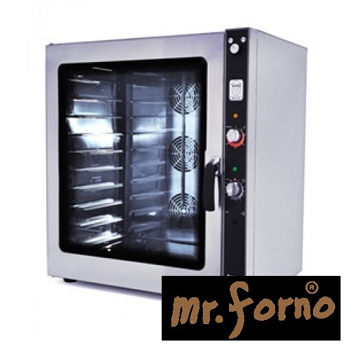 Cuptor pentru patiserie si panificatie. Alimentare: 400V Putere: 13.8kW Dimensiuni (LxAxH): 920x680x1020mm Capacitate: 10 tavi 600x400mm Distanta dintre tavi: 80mm Temperatura: +50/ +270°C Timer: 0-120 minute Sistem cu aburi: umidificare directa Panou de control electromecanic 3 motoare cu 2 sensuri de rotatie Realizat din inox AISI 304